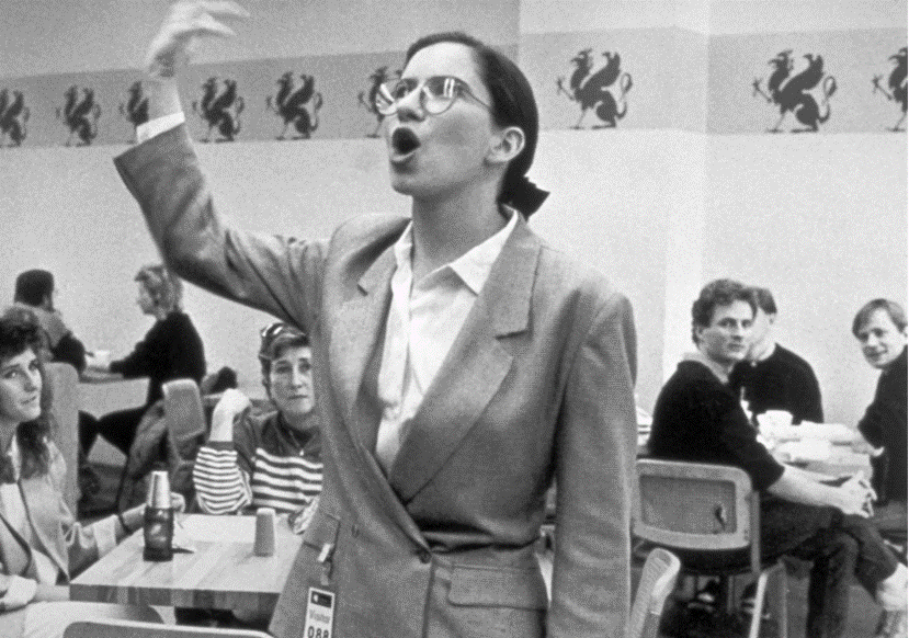 예로 미술관의 ‘출구(Exit)’ 표시에 대하여, “빈틈없는 그림에, 색채와 질감은 섬세합니다. 이 그림은 눈부신 형태의 눈부신 사례입니다”라고 설명하고, 식수가 나오는 식음대를 보며, “정말 멋진 음수대가 아닌가요! 놀라운 경제적 기념비로 고도로 양식화된 형식의 극단성과 대조를 이룬다"라고 설명했다. 미술관 카페테리아를 가리키며 "혁명 전의 식민 미술의 절정을 보여준다. 이곳은 미국 전체 방들 중 가장 훌륭하고 세련된 것으로 이해되어야 한다.... 이방이 당시 우리나라의 대통령이자 총사령관이었던 조지 워싱톤이 자주 오던 방이다"라고 연설하듯이 설명하였다. 또 화장실로 관객들을 인도하여, 그곳을 미의 절정인 듯 묘사하였다. 도슨트가 주로 사용하는 과장된 화법, 미적 취향의 강요를 염두에 두고 그녀가 사용한 온갖 형용사들은 걸작을 묘사할 때 쓰는 현학적이고도 고상한 단어들을 선택하여 설명하였다.