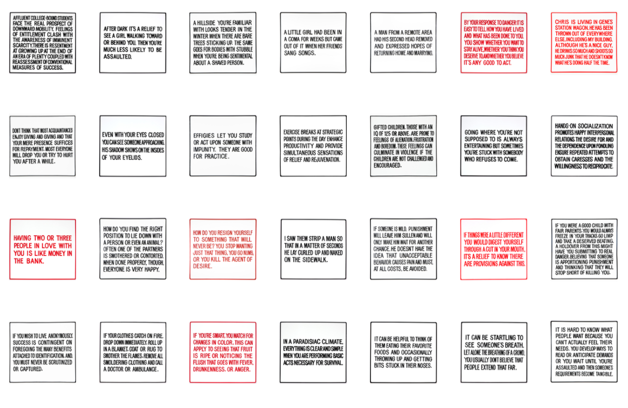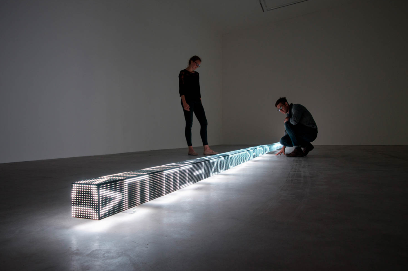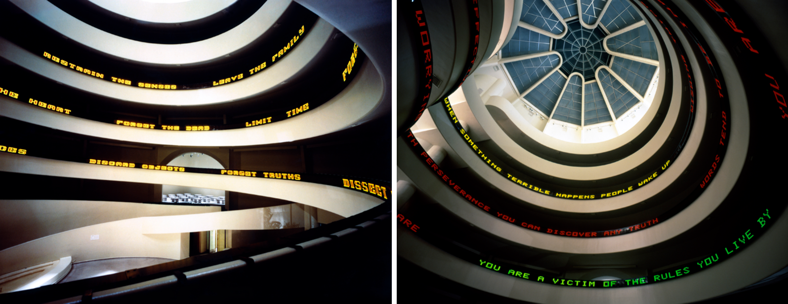 개념 미술가 제니 홀저(Jenny Holzer)는 격언들을 찍은 포스터를 뉴욕 시내 곳곳에 붙이면서 주목을 받았고, 광고 사인처럼 움직이는 텍스트를 담은 LED 작품으로도 유명하다. 공공장소에서 단어와 아이디어를 가지고 자신의 생각을 전달하는 것이 그녀의 주요 작업인 것이다. 즉, 사회적 이슈와 변화에 대한 내러티브나 논평을 텍스트 자체로 이미지화하여 예술적 매체로 만드는 방법으로 대중과 소통한다.